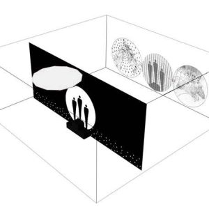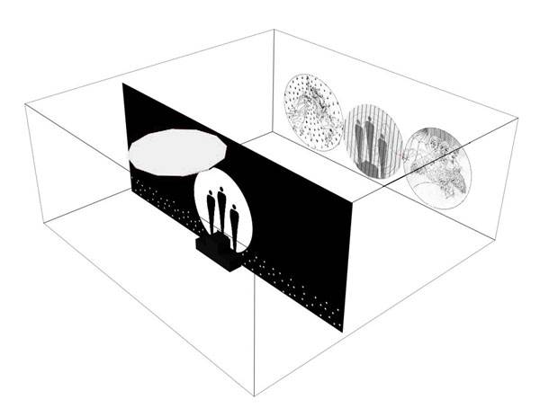 Tanto la barrera/frontera como el anillo/circunferencia que sustenta llevarán orificios de 5 cm de diámetro que permiten al hombre atisbar hacia su trascendencia al otro lado de la barrera/frontera. 3 orificios en el anillo/circunferencia a la altura de los ojos dada por la altura de la tarima e infinidad de ellos en la barrera/frontera a nivel inferior de los premiados. Este lado de la sala en completa oscuridad dejará pasar luz solo por los orificios, semejando el Universo y sus constelaciones de estrellas.