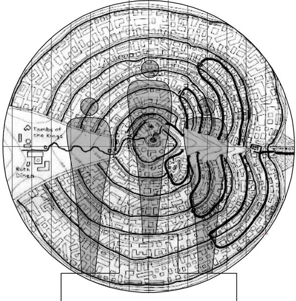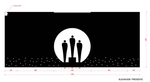 La barrera/frontera negra es de tela también plegable y enrollable. Lleva inserto en su centro 1 anillo/circunferencia blanco que refleja el presente del hombre. Una tarima negra tipo las de premiación en las Olimpíadas estará apoyada en la barrera/frontera en su parte central interviniendo el espacio blanco del anillo/circunferencia.