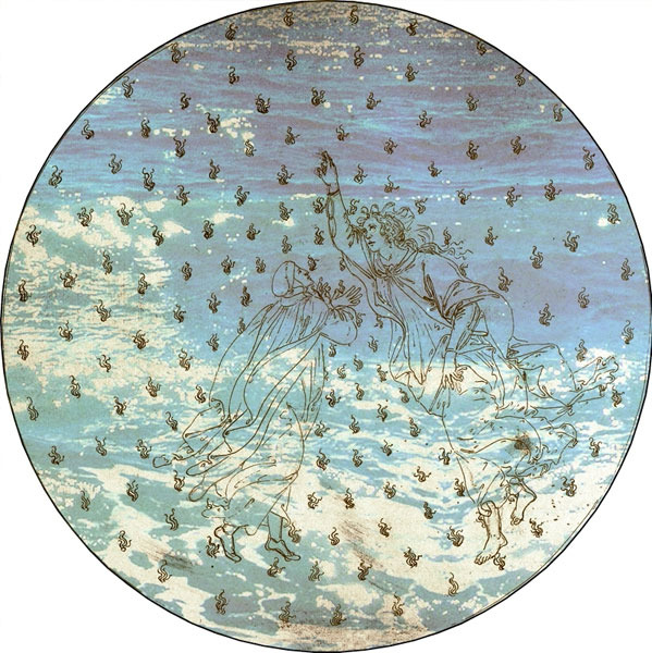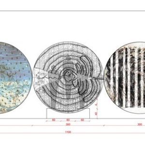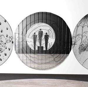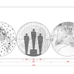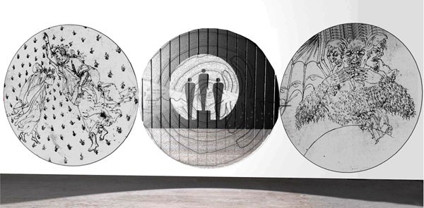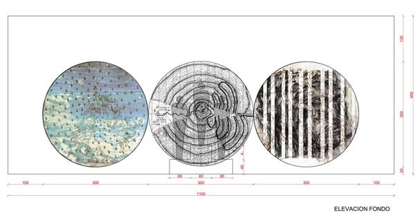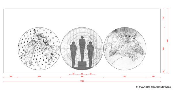 El presente se grafica en 2 anillos/circunferencia, uno sobre la barrera/frontera que separa estas dos facetas en la vida del hombre y otro suspendido en el techo. Al otro lado, la proyección a la trascendencia: Paraíso, Purgatorio e Infierno, se grafica en 3 anillos/circunferencia contiguos posicionados sobre el muro al fondo de la sala.